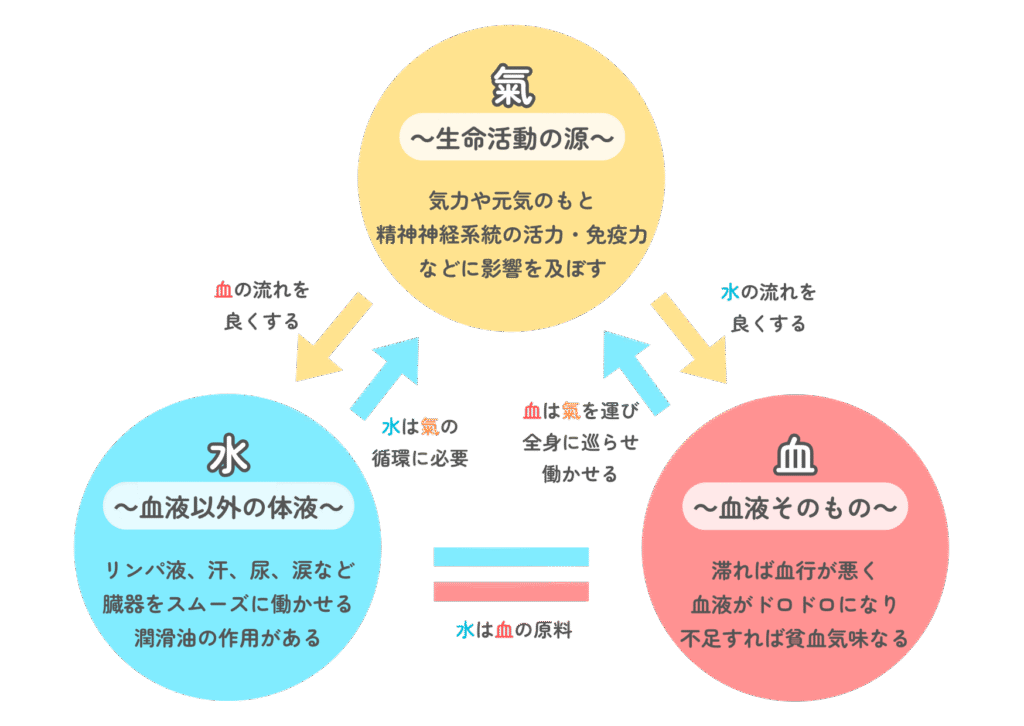 東洋医学では気・血・水のバランスをとることで健康な身体に導いていきます。「気」「血」「水」がきちんと体内で循環していくことで健康な身体を保つことができます。
